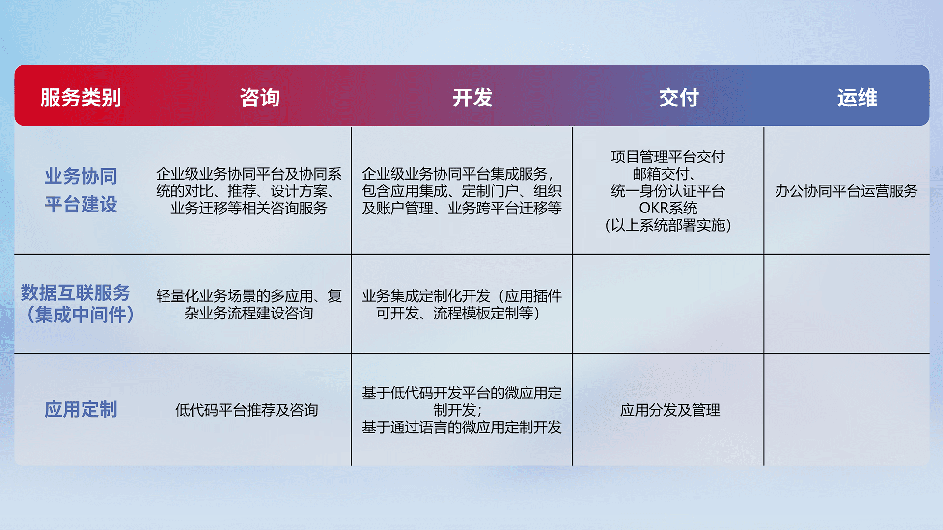 针对钉钉、、、企微、、、、IDaas等平台级产品提供产品的规划、、、、方案、、、交付、、定制化开发等服务,,,实现如统一协同办公、、智能客户服务、、、、混合会议管理、、、、智能数据查询、、、、等业务场景,,,,实现数字化转型。。