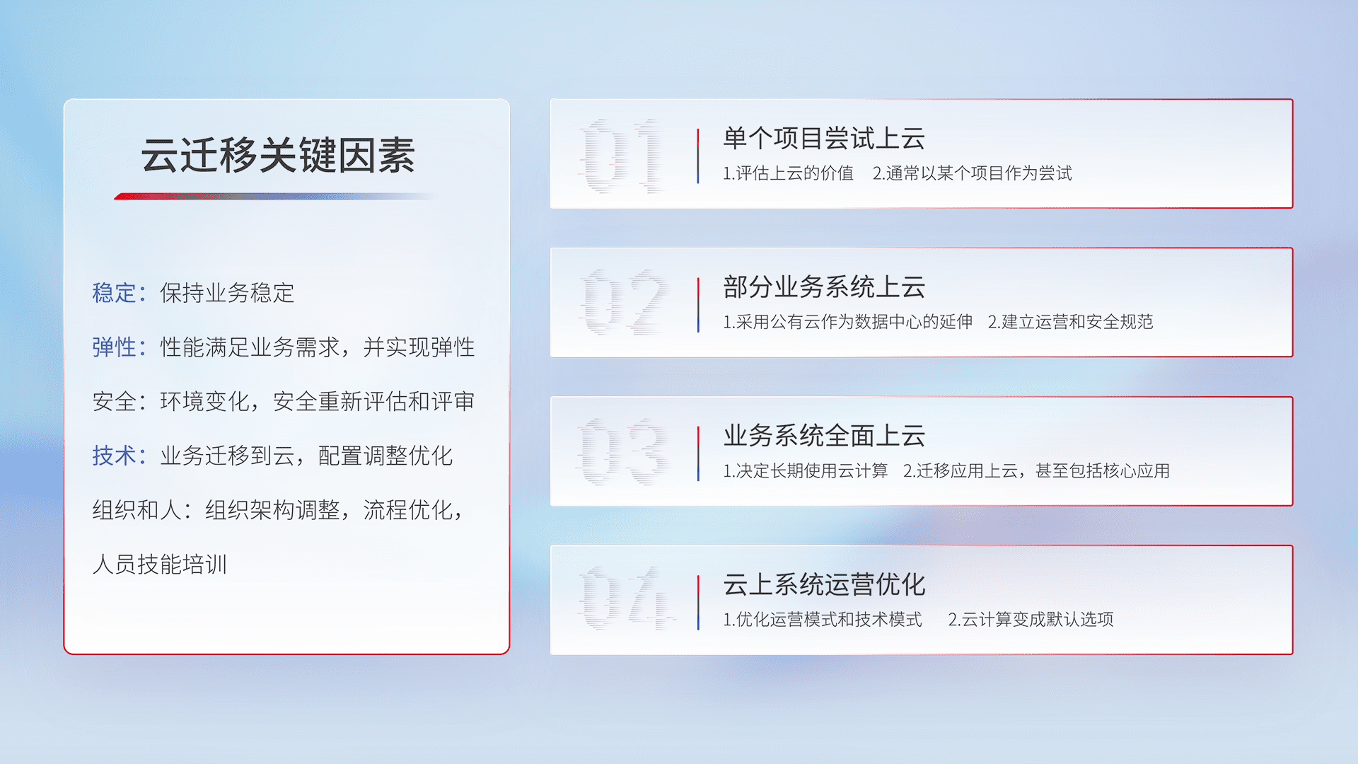 结合实际业务,,从规划设计、、、、云平台选型、、、云原生改造、、、数据迁移、、集成交付,,,,迁移全过程为客户识别最佳上云路径,,做好风险识别管理,,,,设计网络架构、、身份权限、、安全审计合规、、、操作审计、、日志审计、、、、监控告警策略、、、多站点容灾设计等,,,对云上基础设施进行整体规划,,,提升IT治理水平,,,,以满足弹性、、高可用、、、、高性能的需求。。。