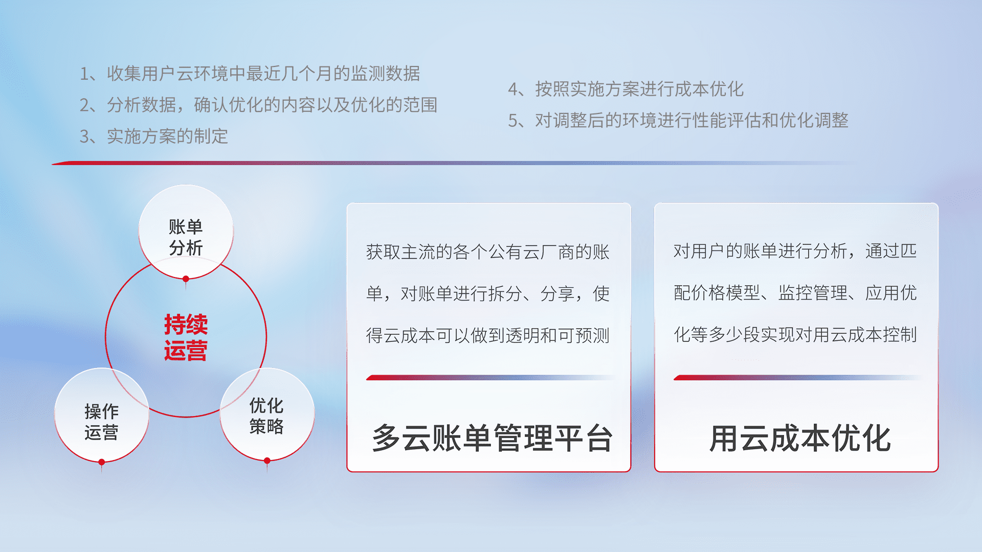 通过多云纳管,,,以统一的资源数据模型把客户的云资源进行抽象和封装,,进而实现对多云资源的统一操作,,,,保障云资源管理的可靠性、、、、稳定性与可用性。。。。量身定制化运维内容,,,,配置、、开发运维、、、补丁管理、、、、备份、、监控、、认证和访问管理、、、、审计和日常巡检等,,,,保障在用云过程中的可靠度,,,,稳定度以及高可用率。。。